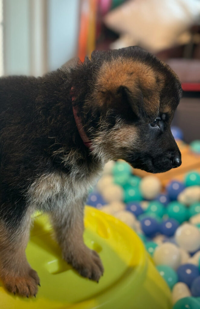 Itsa Ladybug or just Itsa is out of Isa and Quabs. If we had to describe her in just one word it would probably be spunky just like her mom Isa. While she also inherited her fathers love for snuggles, she usually prefers to be out playing and exploring the world. She found her voice very early at just 3 weeks old when she started barking and definitely knows what she wants from life. In the picture she is 6 weeks old and she loved the ball pit.